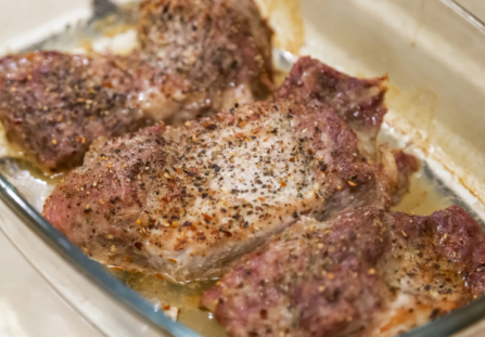 Natrzyj plastry karkówki drugą połową czosnku. Oprósz mięso mieszanką przypraw, solą i pieprzem. Odłóż na pół godziny.