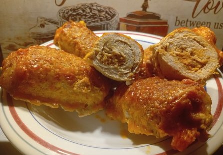 Kotlety osuszyć, posypać solą i pieprzem, rozbić dosyć cienko przez folię. Mięso przełożyć do miski, dodać starty ser, przyprawy i dokładnie wyrobić masę. Następnie na każdy kotlet położyć dwie kopiate łyżki farszu z mięsa mielonego, zwinąć w roladkę i boki spiąć wykałaczkami. Naczynie żaroodporne posmarować olejem, ułożyć roladki i na górę położyć po plasterku sera żółtego, nakryć, wstawić do piekarnika nagrzanego do 180 stopni i piec około 1 godziny. Przed końcem naczynie odkryć i na termo obiegu mięso zrumienić. Wspaniałe mięsko na świąteczny obiad. SMACZNEGO.