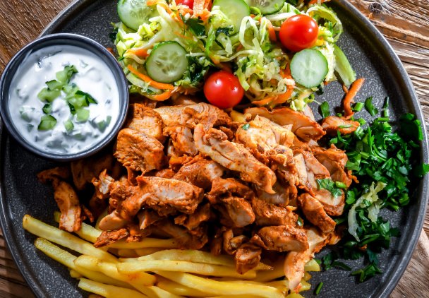 Fast food w domowej wersji - kurczak kebab z lekką surówką i złocistymi frytkami. Do tego obowiązkowo sos do polania mięsa i frytek - w tym przypadku postawiliśmy na tzatziki. Równie dobrze sprawdzi się tutaj również sos czosnkowy, majonezowy czy ketchup. Przygotowanie kurczaka w tym wydaniu wbrew pozorom nie zajmuje dużo czasu. Danie należy jeść tuż po przyrządzeniu, kiedy mięso jest idealnie soczyste, a frytki ciepłe i chrupiące.