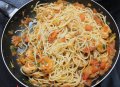 W woku na tym samym oleju co smażyliśmy kurczaka smażymy cebule, imbir i papryczkę chili energicznie mieszając. Po chwili dodajemy paprykę i orzechy a następnie kurczaka. Smażymy cały czas energicznie mieszając.