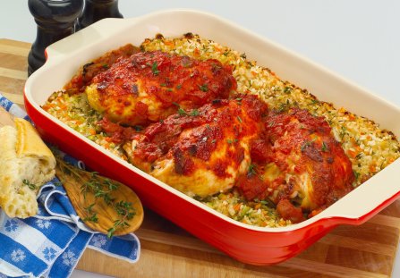 Kurczak pieczony na ryżu to pomysł na jednogarnkowy obiad dla kilku osób. Jak wiadomo, dania jednogarnkowe często wymagają w praktyce użycia kilku naczyń. W tym przypadku potrzebne jest tylko naczynie żaroodporne i deska do krojenia. Co więcej, obiad robi się sam. Wystarczy połączyć wszystkie składniki i wstawić danie do piekarnika.