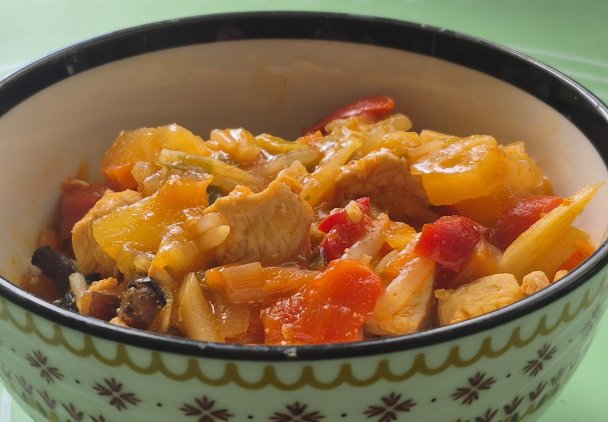 Ugotuj ryż oczyszczony filet pokrój na nieduże kawałki, posól. W woku lub garnku rozgrzej olej, podsmaż mięso, wrzuć mrożone warzywa, smaż razem przez 5 minut, dodaj kawałki ananasa, wlej sos, Dodaj pół szklanki wody, gotuj 10 minut.