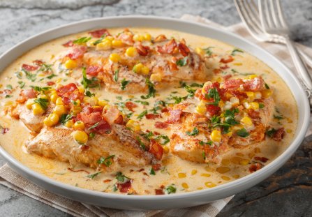 Wlej bulion i mleko. Zagotuj. Dodaj wtedy mascarpone, kminek i paprykę wędzoną. Gotuj na średnim ogniu aż sos zgęstnieje i stanie się kremowy. Dodaj odsączoną kukurydzę, zamieszaj i duś dalej. Na koniec wrzuć chrupiący boczek.