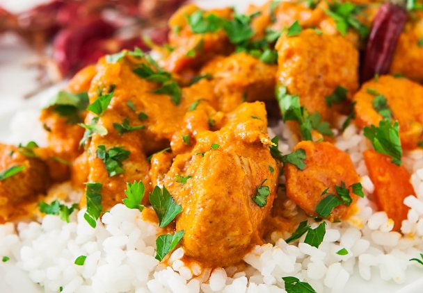 Kurczaka w sosie curry z mlekiem kokosowym podawaj z dodatkiem świeżo ugotowanego ryżu, posypany siekaną natką pietruszki.