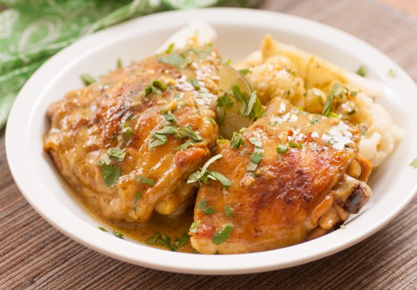 Rozgrzej na patelni (na palniku o średniej mocy) masło. Kiedy zacznie się pienić, ułóż na patelni udka kurczaka skórą do dołu. Smaż przez kilka minut – aż skórka stanie się złocista i chrupiąca. Wówczas obróć udka na drugą stronę i smaż przez kolejnych kilka minut.