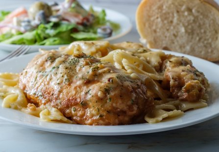 Kurczak w sosie tymiankowym to eleganckie, a zarazem proste danie, które zachwyca aromatem świeżych ziół i lekkością cytrusowego akcentu. Mięso pozostaje soczyste i delikatne. Danie idealnie nadaje się do podawania z makaronem.