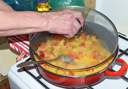 Gdy warzywa trochę zmiękną, dołóż na patelnię marchewkę, ziemniaki i kurczaka. Zalej gorącym bulionem. Duś pod przykryciem na wolnym ogniu, aż warzywa staną się miękkie.