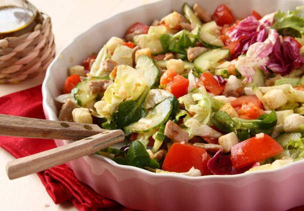 Pomidory obierz ze skórki, pokrój w większą kostkę. Ogórka pokrój w półplasterki. Cebulę posiekaj w cienkie piórka. Mix sałat umyj i osusz, a następnie przełóż do miski. Dodaj pozostałe składniki i zamieszaj.