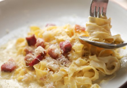 Makaron tagliatelle z boczkiem i śmietaną to pomysł na szybki, sycący obiad dla całej rodziny. Przygotowanie sosu nie powinno wam zająć więcej czasu, jak gotowanie makaronu. Danie można wzbogacić do dodatek pomidorków koktajlowych i natki pietruszki, ale nie jest to konieczne. Makaron z boczkiem i śmietaną cudownie smakuje z dodatkiem tartego parmezanu.