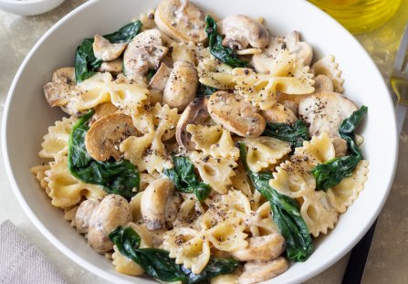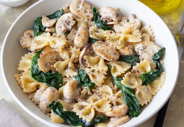 Makaron z pieczarkami i szpinakiem podawaj na ciepło, posypany parmezanem i świeżo startym czarnym pieprzem.