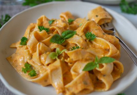 Makaron z sosem dyniowym to wspaniałe jesienne danie, pełne koloru i intensywnego zapachu. Rozgrzewający imbir, delikatne mleko kokosowe i aromatyczna pasta curry to tylko podstawa do stworzenia kolacji albo obiadu dla całej rodziny. Królową w tym daniu jest oczywiście dynia, świetnie przyprawiona i o kremowej konsystencji sosu.
