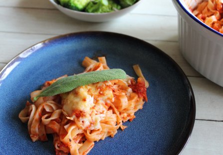 Do naczynia żaroodpornego przełożyć makaron, polać sosem i posypać serem. Piec w temperaturze 175 stopni C przez 20 minut.