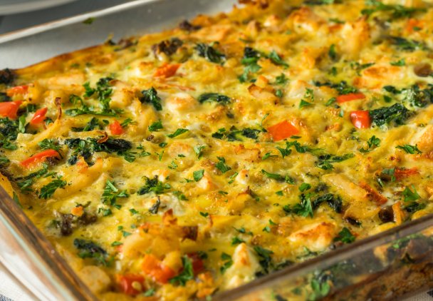 Sycąca zapiekanka z kurczakiem, warzywami i żółtym serem. Niezwykle sycąca. Idealna na obiad jednogarnkowy dla całej rodziny.