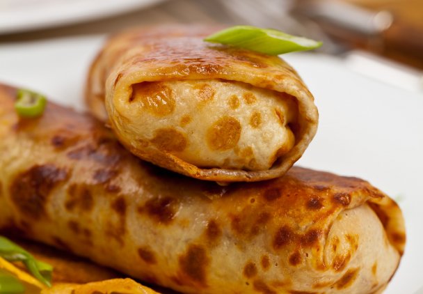 Na rozgrzanej patelni rozprowadzaj cienką warstwę ciasta naleśnikowego. Smaż z obu stron po ok. 2 minuty aż będą lekko rumiane. Na każdy naleśnik nałóż porcję farszu blisko krawędzi, zwiń w rulon lub złóż w kopertę. Możesz je dodatkowo podsmażyć na patelni z dwóch stron, aby były bardziej chrupiące z zewnątrz.