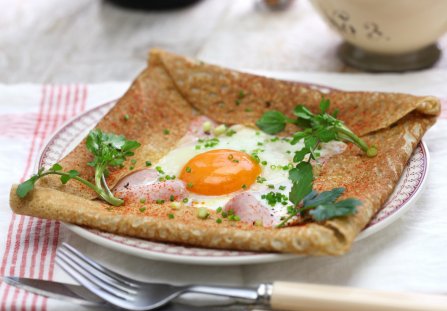 To danie to coś pomiędzy klasycznym naleśnikiem a francuskim galette complète, czyli wytrawnym naleśnikiem z mąki gryczanej. Ma delikatnie orzechowy smak, chrupiące brzegi i doskonale łączy się z aromatycznym nadzieniem z szynki, sera i jajka. Naleśniki po bretońsku są świetne na śniadanie, lunch lub ciepłą kolację. Dobrze smakują z kilkoma kroplami ostrego sosu.