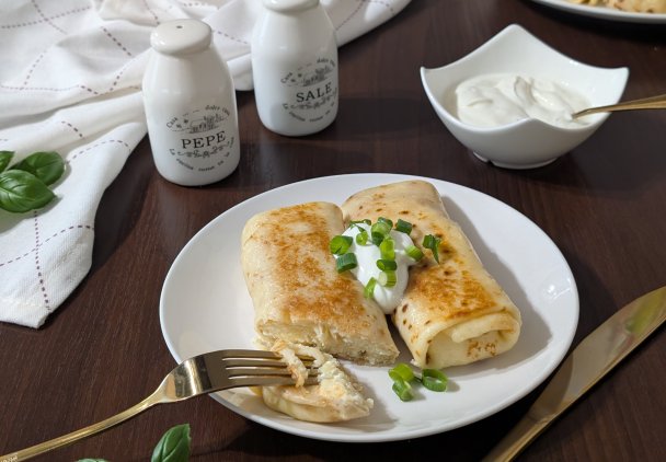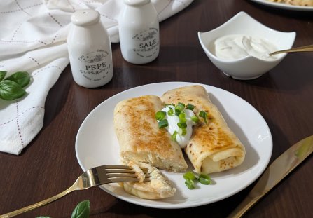 Tak przygotowane naleśniki, obsmażyć na niewielkiej ilości oleju, z obu stron na złoty kolor. Naleśniki podałam z sosem śmietanowo jogurtowym. Wymieszałam śmietanę 18% z jogurtem greckim, przyprawiłam do smaku solą i pieprzem.
