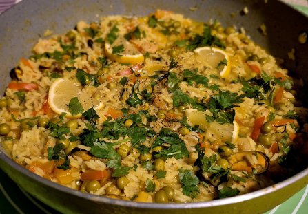 Wlej bulion. W razie potrzeby odrobinę posól gotuj 15 minut, dodaj mieszankę owoców morza i odsączony groszek, wymieszaj, gotuj jeszcze 5 - 6 minut, aż ryż wchłonie płyn i zmięknie.