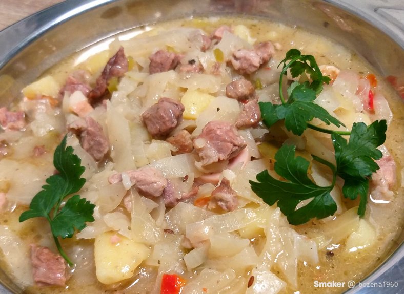 Boczek świeży po oczyszczeniu pokroić w kostkę. Z kapusty usunąć uszkodzone, zwiędłe liście wyciąć głąb i pokroić w grubszą kostkę lub po prostu poszatkować . Pokrojony boczek wytopić i odstawić na boku. Pokrojoną kapustę przełożyć do garnka postawić na ogniu i gotować bez przykrycia około 10 minut po czym dodać pokrojone w kostkę ziemniaki , gotować razem kilka minut . Na pozostałym boczku zeszklić cebulę , mieszając dodać mąkę wymieszać z kilkoma łyżkami wody i zagotować . Zasmażkę wlać do garnka z kapustą i ziemniakami doprawić pieprzem ,dodać soku z cytryny i wymieszać , podawać gorącą. Porada; Można dodać pokrojoną w plastry podsmażoną kiełbasę oraz kawałek pokrojonej papryki czerwonej ale nie koniecznie.