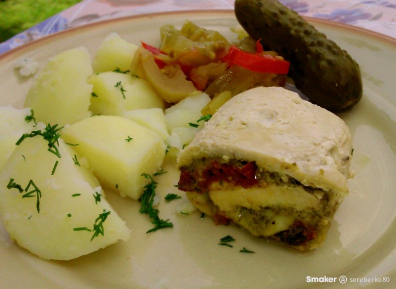 Pierś zwinąć w roladkę (można spiąć wykałaczkami, ja tego nie robiłam). Tak przygotowane mięso ułożyć w naczyniu do zapiekania i zapiekać w piekarniku przez ok. 25 min. w temperaturze 190°C. Podawać z ulubionymi dodatkami. Smacznego :-)