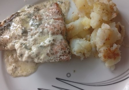 4 płaty łososia, każdy ok 200 g. Śmietanka kremowa , koperek. Ziemniaczki ugotowane w mundurkach i podsmażone.