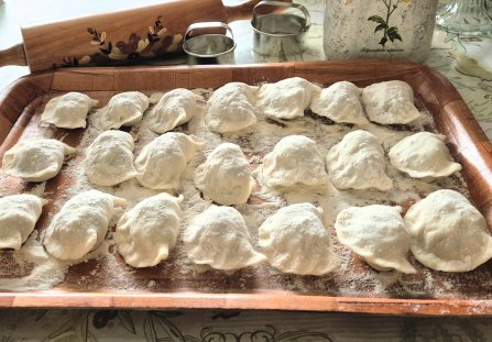 Lepimy i gotujemy pierogi: Ciasto dzielimy na dwie części. Jedną odkładamy pod przykrycie, drugą wałkujemy cienko (ok. 2 mm) i szklanką wyciskamy kółka. Na środek każdego kółka nakładamy czubatą łyżeczkę farszu. Składamy krążek na pół i zlepiamy dokładnie brzegi uważając, aby nadzienie nie wchodziło w zlepiany brzeg, bo pierogi będą się rozklejać podczas gotowania. Pierogi ulepione układamy na tacach tak, aby się nie stykały, podsypujemy obficie mąką. Wkładamy do zamrażarki na 4-5 godzin co najmniej. Po tym czasie przekładamy je do woreczków nylonowych.