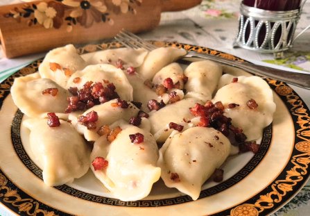 Pierogi z ziemniakami i boczkiem, polane smażoną śmietaną to rarytas, z którym spotkałyśmy się po raz pierwszy w Bieszczadach, w małej wsi Klimkówka. To piękna wieś, gdzie mieszały się przez wieki różne kultury i tradycje-polska, ukraińska i łemkowska. Efektem tej mieszanki są wspaniałe potrawy, między innymi te pyszne pierogi okraszone, kwaskową, wysmażoną na złocisto dobrą, wiejską śmietaną. Jest tylko jeden malutki problem. Potrzebna jest doskonała śmietana, taka wiejska, a my dzisiaj jej nie mamy. Okrasimy więc nasze pierogi boczkiem i wędzoną słoniną.