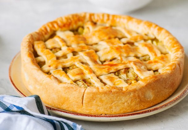 Nadzienie włóż do formy od tarty wyłożonej ciastem. Następnie na wierzchu porozkładaj równo wycięte wcześniej paseczki, tworząc kratownicę.