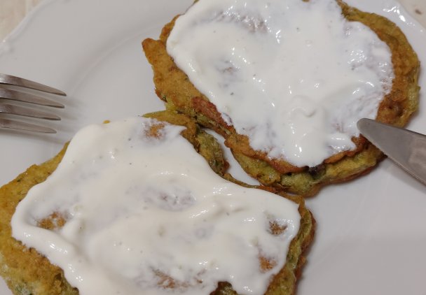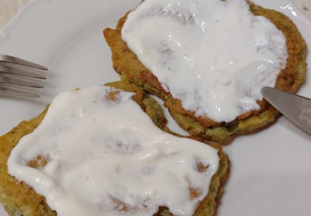 Bób ugotować w osolonej wodzie, obrać rozgnieść widelcem i dodać sól, pieprz do smaku, 2 jajka, łyżkę mąki, posiekany szczypiorek i wszystko dobrze wymieszać do połączenia składników. Na patelni rozgrzać olej i kłaść placuszki, smażyć z obu stron na złoty kolor. Wyłożyć na talerze na wierzchu rozsmarować sos śmietanowy.