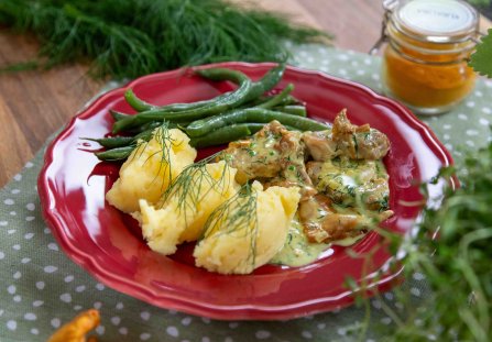 Mięso obsmażyć z obu stron na mocno rozgrzanym maśle. Przełożyć do sosu. Przykryć i dusić do miękkości. Pod koniec wrzucić posiekany koperek.