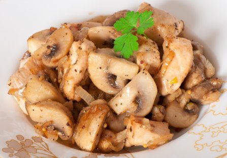 Pokrój cebulę na półplasterki. Posiekaj czosnek. Umyj pieczarki i pokrój na plasterki. Osusz. Jeśli to konieczne, dołóż na patelnię trochę masła.