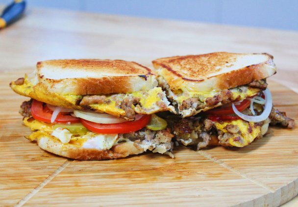 Rozgrzewamy mocno patelnię, wlewamy odrobinę oliwy, na gorący tłuszcz wrzucamy pokrojoną w kostkę 1/2 cebuli i podsmażamy 1 minutę, następnie dodajemy pokrojony w plasterki czosnek, całość mieszamy i podsmażamy 30 sekund, następnie dodajemy mięso mielone, roztarty majeranek z tymiankiem, dodajemy sól i pierz do smaku, całość mieszamy i podsmażamy tak aby mięso nie było grudowate. Jak już mięso będzie podsmażone, dodajemy jajka, rozciągamy je po całej powierzchni patelni tak aby pokryło całe mięso, całość doprawiamy solą. Następnie układamy na górę plasterki sera żółtego, na ser układamy tosty, zmniejszamy płomień na minimum i podsmażamy aż jajko się zetnie. Po kilku minutach przewracamy umiejętnie zawartość patelni i podsmażamy od strony tostów, aż się zarumienią, zapraszam serdecznie na film z przepisem, tam dokładnie pokazuję jak to zrobić. Gdy tosty się zarumienią, ściągamy je z patelni, kroimy na pół, nakładamy majonez i ketchup, dorzucamy ogórki, pomidory i cebulę. Tosty składamy w kanapkę i gotowe!!! Smacznego!!!