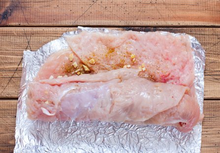 Na każdym rozbitym filecie rozłóż porcję farszu. Zwiń ciasno w roladę, zaczynając od krótszego boku. Każdą roladkę owiń bardzo szczelnie dwiema warstwami folii aluminiowej, formując ciasny wałek.