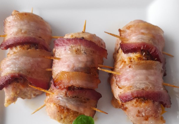 Zwinąć w roladki , spiąć wykałaczkami, doprawić przyprawą do mięsa wieprzowego, otoczyć plasterkami boczku , gdy są małe spiąć wykałaczkami. Umieścić w naczyniu żaroodpornym.