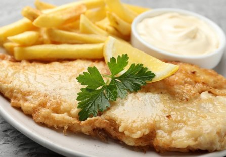 Ryba na piątek smażona w cieśnie naleśnikowym, podana w towarzystwie frytek i sosu majonezowego. Obiad palce lizać! Zrobicie go w niespełna pół godziny.