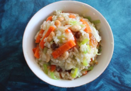 Rodzynki oraz orzeszki wsypać do ugotowanego ryżu. Gotową potrawę doprawić solą i pieprzem oraz mielonym imbirem. Smacznego! :)