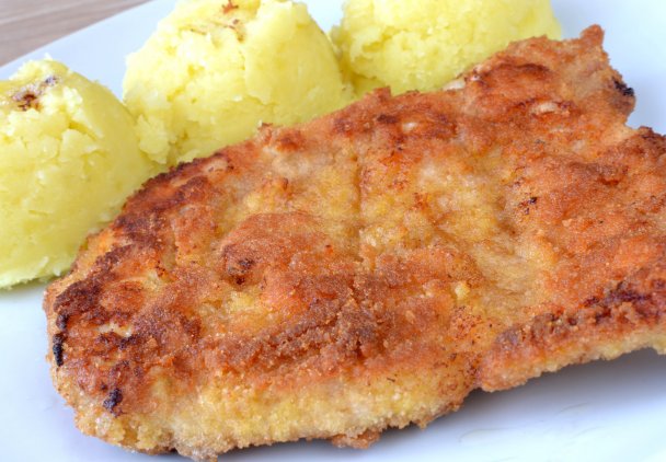 Uważaj podczas układania składników na talerzu. Nie podawaj schabu na parujących ziemniakach albo ciepłych frytkach, bo panierka przestanie być chrupiąca.