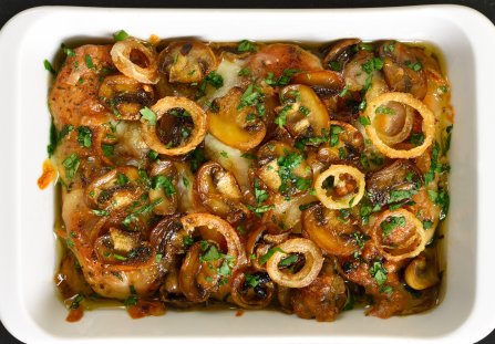 Soczysty schab z pieczarkami i cebulą z piekarnika. Bez zmywania sterty naczyń i długiego przesiadywania w kuchni. Mięso duszone w sosie jest soczyste i aromatyczne nawet po odgrzaniu. Świetnie smakuje z tłuczonymi ziemniakami i lekką sałatką.