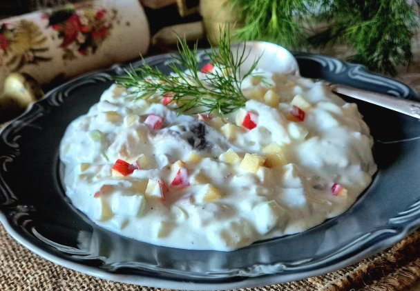 Śledź z jabłkiem i cebulą w śmietanie gotowy!