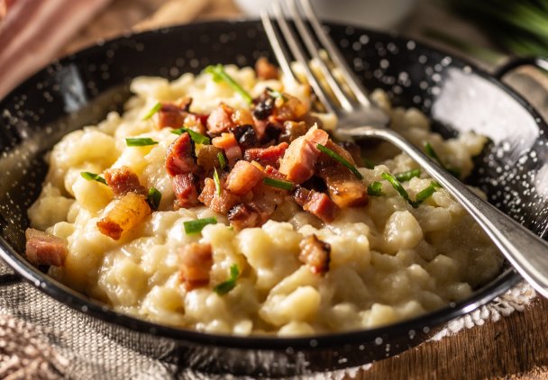 Słowackie haluszki, czyli przecierane kluseczki z tartych ziemniaków dodatkiem bryndzy i chrupiących skwarek z boczku. Proste danie z tanich składników, a do tego niesamowicie sycące. Dzięki dodatkowi bryndzy danie ma niezwykle wyrazisty, słony, lekko pikantny smak.