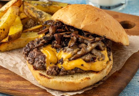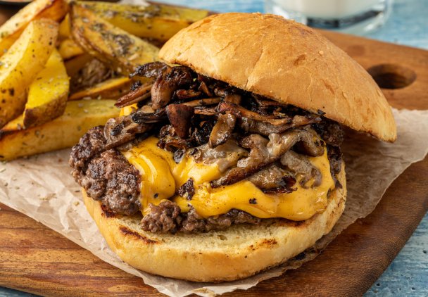Smash burger to prawdziwy hit ostatnich miesięcy. Mięso mielone smażone jest na cienkie dwa kotlety, które przekłada się serem cheddar. Dzięki temu pięknie się topi od ciepła. Proponujemy serwowanie burgera z pieczarkami i cebulką prażoną, a także aromatycznym sosem.