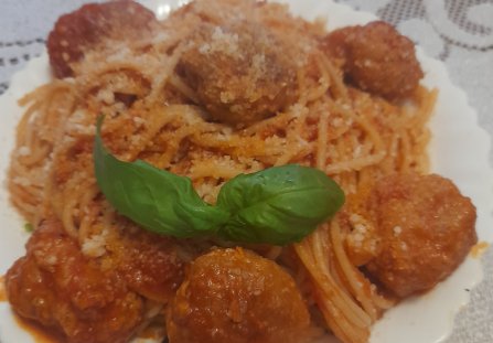 Mięso solimy, czosnek drobno kroimy, dodajemy 3 łyżki parmezanu, solimy do smaku. Mieszamy dokladnie I formujemy malutkie pulpeciki. Pulpeciki smażymy na rozgrzanej oliwie z obu stron na złoty kolor. Pod koniec smażenia dodajemy czosnek. Następnie wlewamy passate pomidorowa , papryczki, solimy do smaku i dodajemy kostkę rosołową. Gotujemy Ok 30 minut na wolnym ogniu . Dodajemy porwane listki bazylii. Spagetti gotujemy aldente. Makaron dodajemy do sosu z pulpecikami i podajemy posypany startym parmezanem. Smacznego.