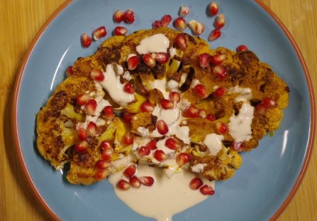 Upieczone steki z kalafiora przełóż na dwa talerze, a następnie pokrop je niewielką ilością sosu, posyp pestkami granatu i posiekaną natką, jeśli masz (moja natka niestety zmarniała przez mroźne noce).