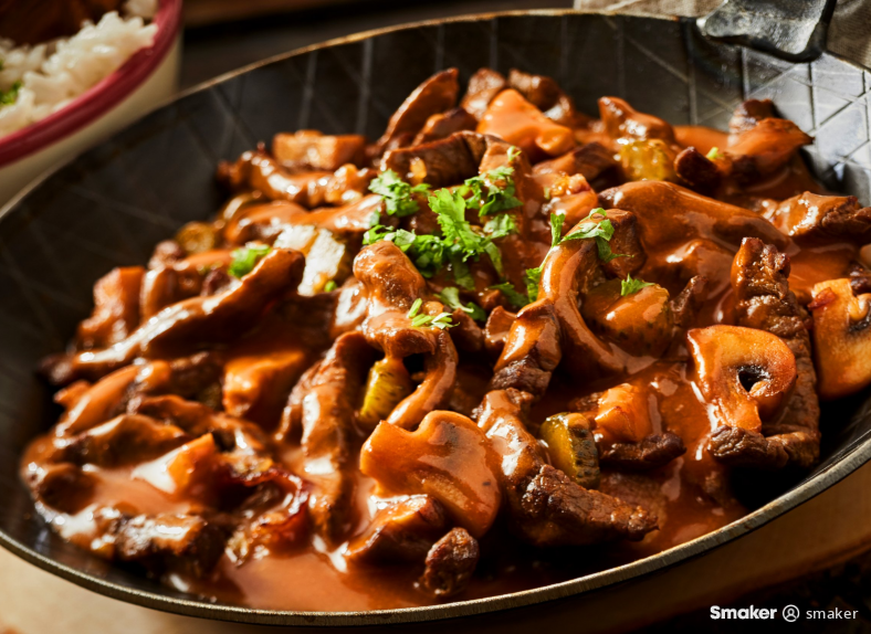 Stroganoff pochodzi z kuchni rosyjskiej i został po raz pierwszy przyrządzony na początku XIX w. na cześć hrabiego Pawła Stroganowa przez jego (najpewniej) francuskiego kucharza. Potrawa zawiera rozpływające w ustach kawałki polędwicy wołowej, z grzybami, cebulą, w aksamitnym, kremowym sosie. Sekretem konsystencji mięsa jest jej szybkie obsmażenie na bardzo rozgrzanym tłuszczu, a następnie duszenie z aromatycznymi dodatkami. Stroganoff podawaj na białym ryżu, domowym makaronie jajecznym, z ziemniaczanym puree lub gotowanymi warzywami. Do przygotowania dania możesz użyć drogiej polędwicy wołowej lub tańszej - lecz równie smacznej- karkówki.