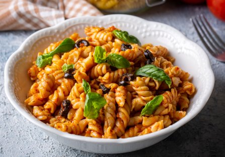 Podgrzej sos i połącz z makaronem. Przełóż na talerze. Udekoruj pokrojonymi na plasterki oliwkami i listkami bazylii.