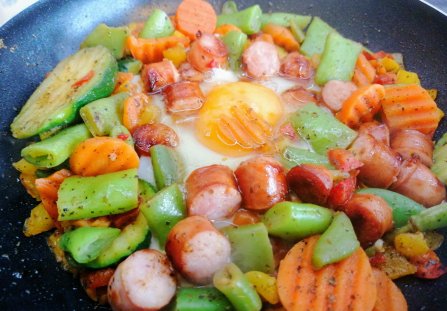 Dodajemy parówki do warzyw. Parówki powinny się lekko podsmażyć - wystarczy kilka minut. Dzięki temu całość będzie bardziej treściwa.