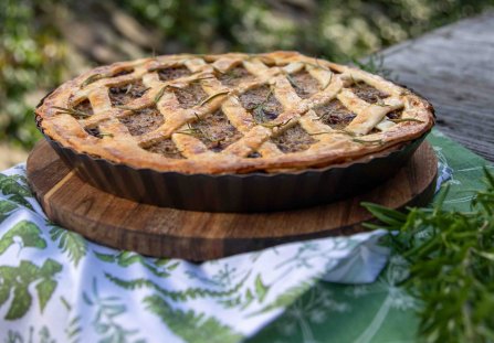 Resztę schłodzonego ciasta rozwałkować, pokroić w paski i zrobić z nich kratkę na kapuście z grzybami. Posmarować roztrzepanym jajkiem. Udekorować igiełkami rozmarynu.