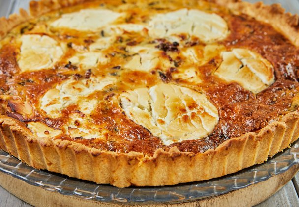 Tarta z kozim serem charakteryzuje się pysznym i bogatym, kremowym wnętrzem z karmelizowaną cebulą i pikantnym serem.
