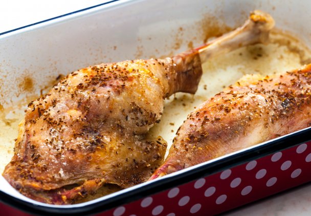 Udka z gęsi pieczone długo w stosunkowo niskiej temperaturze są idealnie miękkie, a mięso z łatwością odchodzi od kości. Chrupiącą skórkę można osiągnąć w końcowej fazie pieczenia.