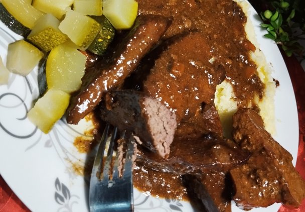 Po wyparowaniu dodanej wody gdzie powstanie sos wątroba wychodzi krucha może nie jest idealnie miękka jak drobiowa ale to urok wątroby wieprzowej. Gotową wątrobę można podać kto z czym lubi ja podałam z ziemniakami oraz cukinią którą robiłam na zimę