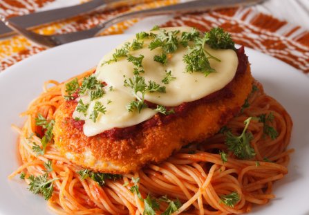 Ten włoski kotlet zaserwujesz na spaghetti w sosie pomidorowo-cebulowym. Dzięki temu danie jest kompletne, aromatyczne, a do tego ciekawie podane na talerzu. Kotlety w każdej chwili możesz podgrzać w piekarniku, wciąż będą chrupiące i soczyste.